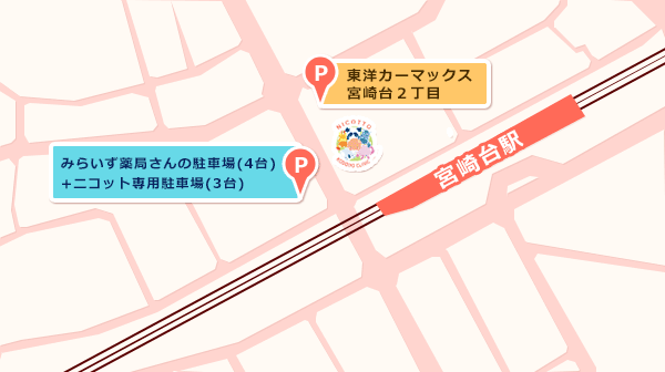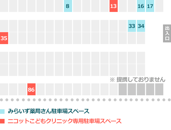 ニコットこどもクリニックの道路を挟んだ正面駐車場です。 「8番」「16番」「17番」「33番」「34番」になります。 「みらいず薬局」と車停めに書いてあります。 なお、従来の提携駐車場もご利用ができます。